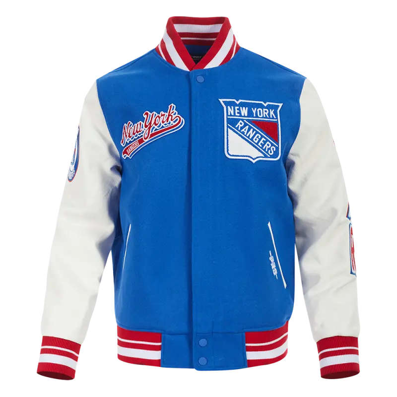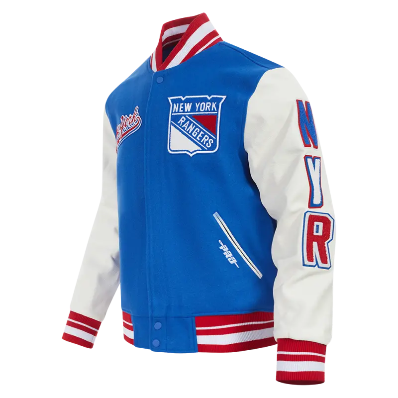 NHL NEW YORK RANGERS RETRO CLASSIC MEN’S RIB WOOL VARSITY JAC (EGGSHELL\/ ROYAL BLUE)