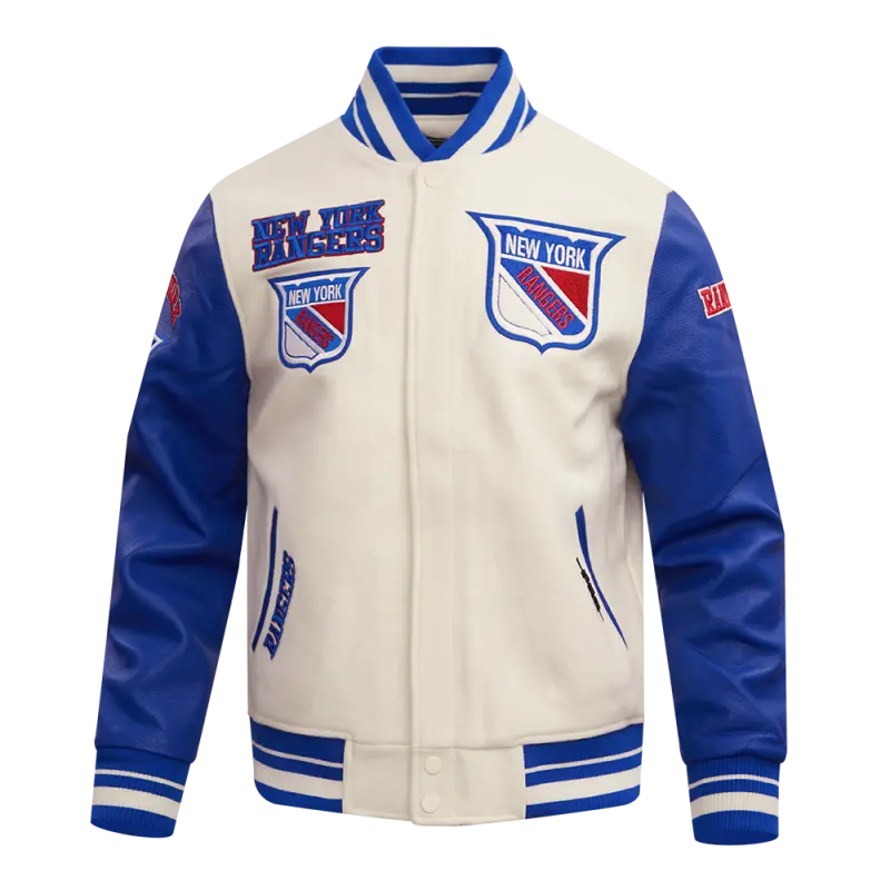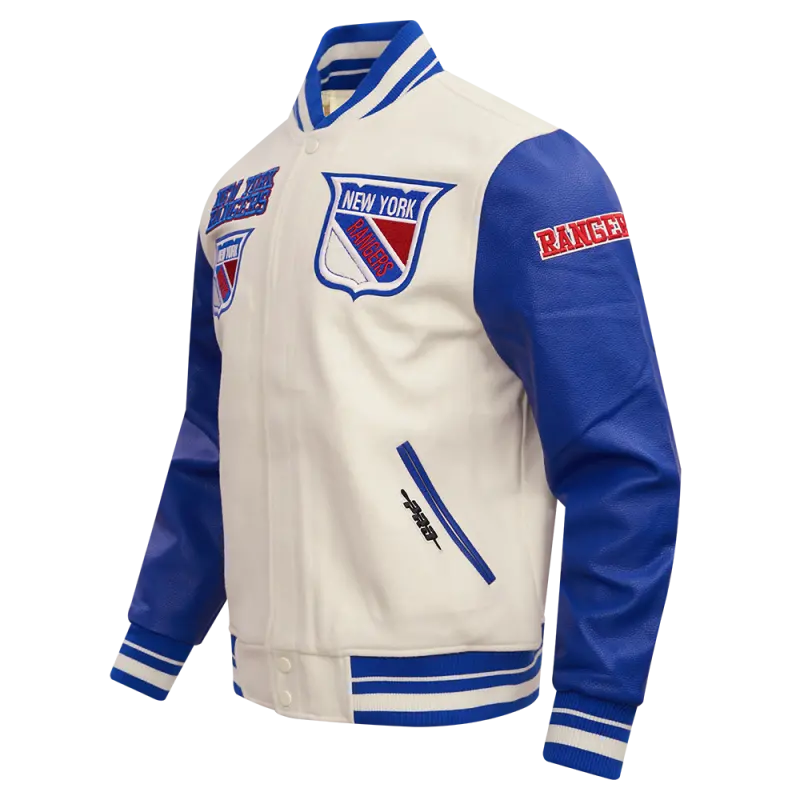 NHL NEW YORK RANGERS RETRO CLASSIC MEN’S RIB WOOL VARSITY JAC (EGGSHELL\/ ROYAL BLUE)