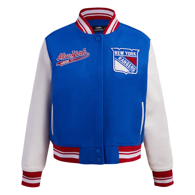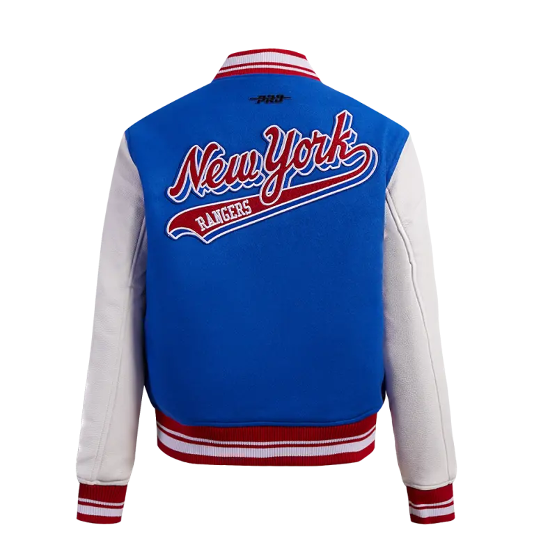 Home / Shop / JACKETS / NHL NEW YORK RANGERS SCRIPT TAIL WOMEN’S WOOL VARSITY JACKET (ROYAL BLUE\/RED)